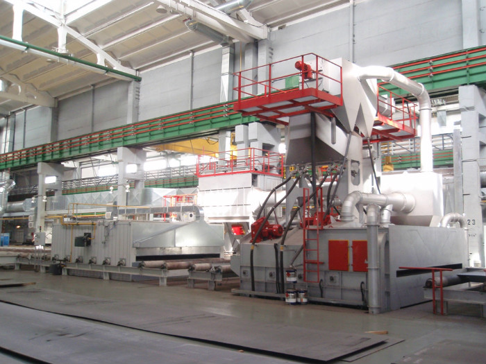 鋼材預(yù)處理線是指鋼材在加工前(即原材料狀態(tài))進(jìn)行表面拋丸除銹并涂上一層保護(hù)底漆的加工工藝設(shè)備。鋼材經(jīng)過預(yù)處理可以提高機(jī)械產(chǎn)品和金屬構(gòu)件的抗腐蝕能力,提高鋼板的抗疲勞性能,延長其使用壽命;同時(shí)還可以優(yōu)化鋼材表面工藝制作狀態(tài),有利于數(shù)控切割機(jī)下料和精密落料。此外由于加工前鋼材形狀比較規(guī)則,有利于機(jī)械除銹和自動(dòng)化噴漆,因此采用鋼材預(yù)處理可大大提高清理工作的效率,減輕清理工作的勞動(dòng)強(qiáng)度和對(duì)環(huán)境的污染。